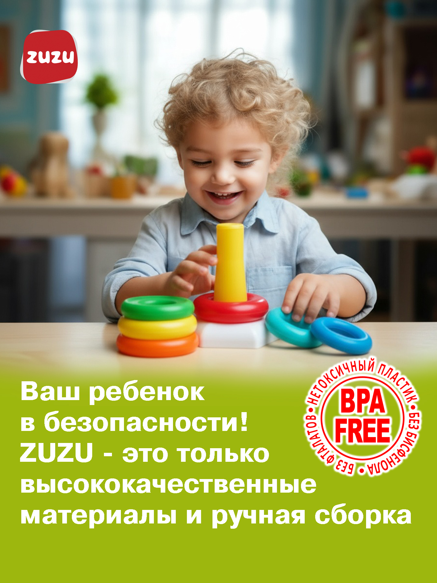 Ищете игрушку, которая не только увлечёт малыша, но и принесёт пользу? Представляем вам яркую и безопасную пирамидку от ZUZU TOYS — идеальный инструмент для раннего развития вашего ребёнка!